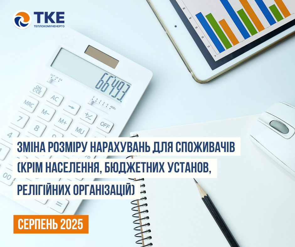 Повідомлення щодо зміни розміру нарахувань за теплову енергію, послугу з постачання теплової енергії та послугу з постачання гарячої води для категорії інші споживачі (крім населення, бюджетних установ, релігійних організацій) за серпень 2025 року
