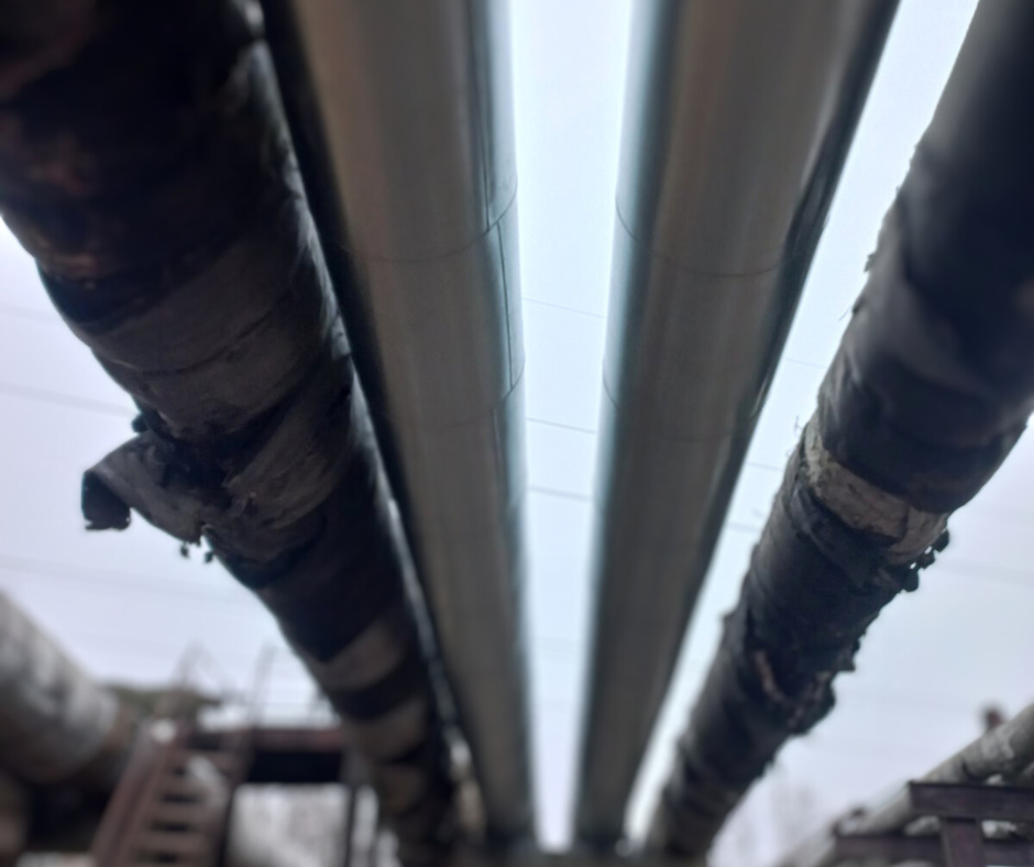 Триває очищення труб від корозії та старого утеплювача, а також підготовка поверхонь до ґрунтування. Будівельне сміття активно вивозиться, щоб забезпечити порядок на ділянках, де замінюється теплоізоляційне покриття.