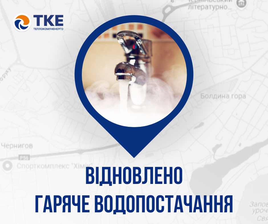 О 16:00 16.04.2025 р., після проведення аварійно-ремонтних робіт, відновлено гаряче водопостачання в житлових будинках за адресами: