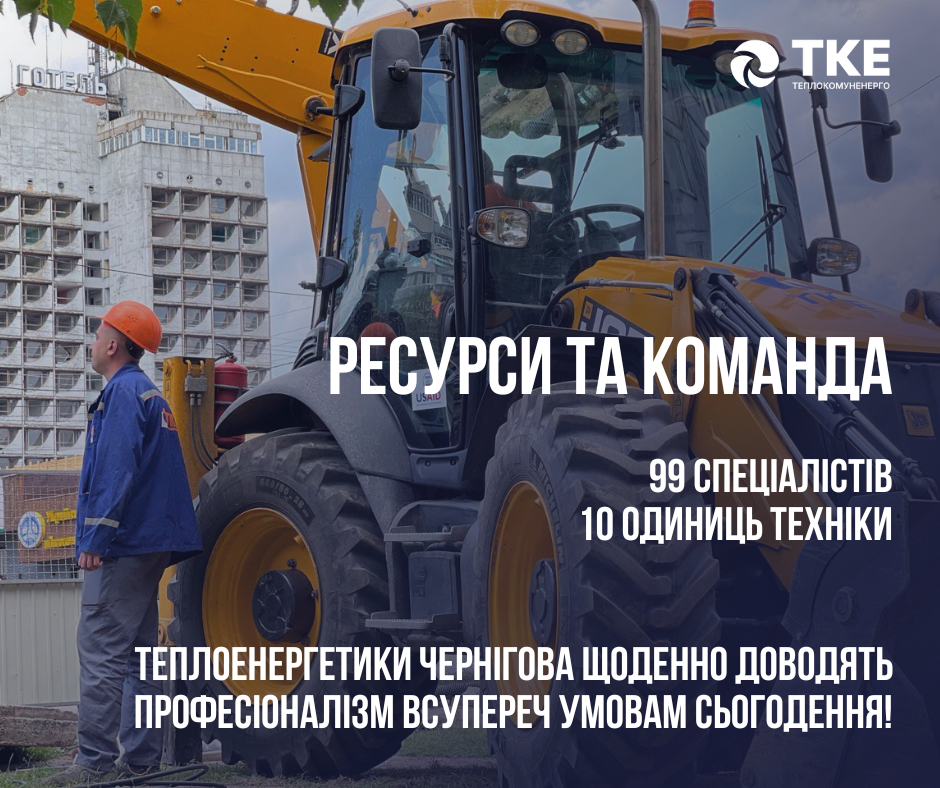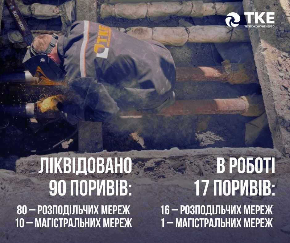 Під час ліквідації пошкоджень трубопроводів теплових мереж було залучено 99 спеціалістів та задіяно 10 одиниць техніки (аварійні машини, екскаватори, самоскиди).