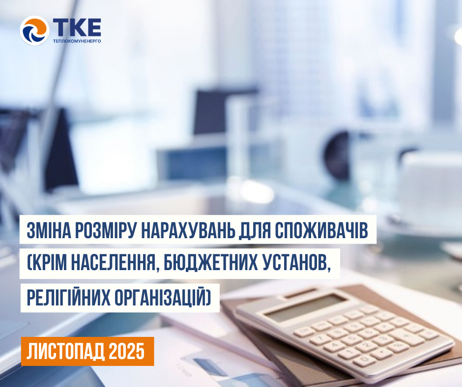 Комунальне підприємство «Теплокомуненерго» Чернігівської міської ради повідомляє про прийняте рішення щодо зміни розміру нарахувань за теплову енергію, послугу з постачання теплової енергії та послугу з постачання гарячої води для споживачів (крім населення, бюджетних установ, релігійних організацій) за листопад 2025 року.