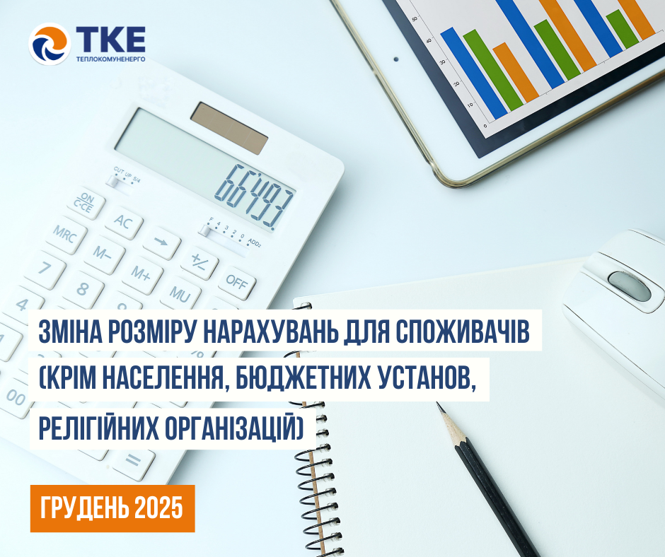 Комунальне підприємство «Теплокомуненерго» Чернігівської міської ради повідомляє про прийняте рішення щодо зміни розміру нарахувань за теплову енергію, послугу з постачання теплової енергії та послугу з постачання гарячої води для споживачів (крім населення, бюджетних установ, релігійних організацій) за грудень 2025 року.