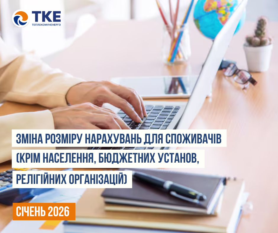 Комунальне підприємство «Теплокомуненерго» Чернігівської міської ради повідомляє про прийняте рішення щодо зміни розміру нарахувань за теплову енергію, послугу з постачання теплової енергії та послугу з постачання гарячої води для споживачів (крім населення, бюджетних установ, релігійних організацій) за січень 2026 року.
