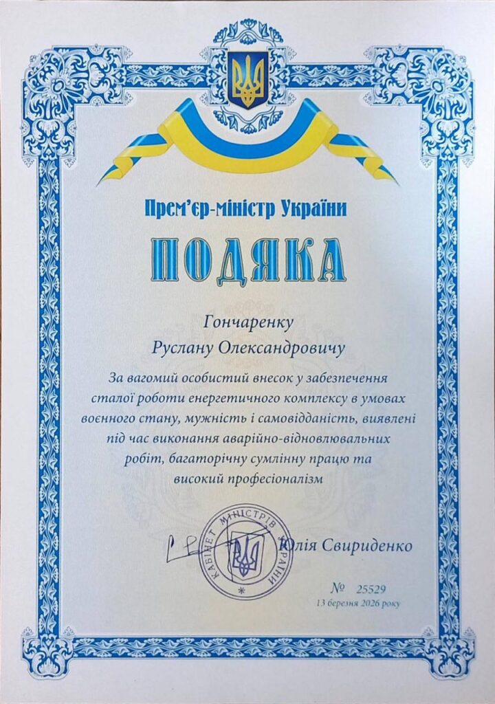 Гончаренко Руслан Олександрович, начальник цеху теплових мереж КП «ТКЕ», отримав Подяку Прем’єр-міністра України за вагомий особистий внесок у забезпечення сталої роботи енергетичного комплексу в умовах воєнного стану, мужність і самовідданість, виявлені під час виконання аварійно-відновлювальних робіт, багаторічну сумлінну працю та високий професіоналізм.